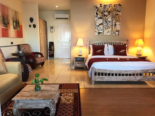 Auf der gegenüberliegenden Seite befindet sich eine geräumige Sitzecke mit einer gemütlichen Couchgarnitur und einem Couchtisch. Die Zimmer sind alle klimatisiert und mit einem zusätzlichen Ventilator ausgestattet.
