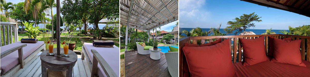 Unsere 2 Bungalows mit Meerblick und Terrasse sind mit antikem, weißem Holz und Rattanmöbeln ausgestattet, die den typischen indonesischen Stil präsentieren. Die Doppelbettzimmer sind mit einem Queen Size Bett (160 x 200 cm), 2 Nachttischen und einem Kleiderschrank mit indirekter Beleuchtung ausgestattet.